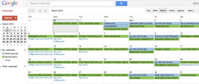 I have always used Microsoft Word calendars to type up my menus.  This is easier than handwriting for lots of reasons. First you have access to the previous months with just a few keystrokes.  Then, you can cut and paste from previous months for the regular meals.  You can print as many copies as you like.  Finally you can change it easily if needed.  This month I am trying a new method – using google calendar.  I like this even better because it syncs with your regular event calendar and it also already lists holidays, both of which you would have to type into Word.  Here’s this month’s menu:
